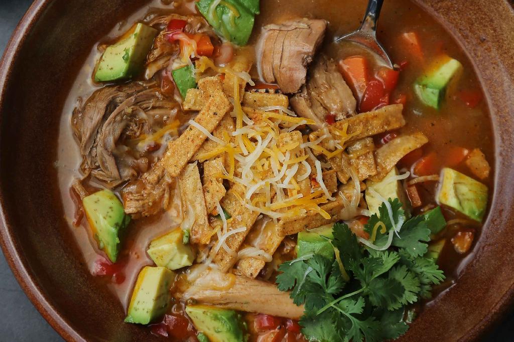 Step #4 After the soup is done cooking, discard pheasant bones. Season soup to taste with more chicken bouillon. Serve soup topped with diced avocado, shredded cheese, crispy tortilla strips and freshly chopped cilantro.