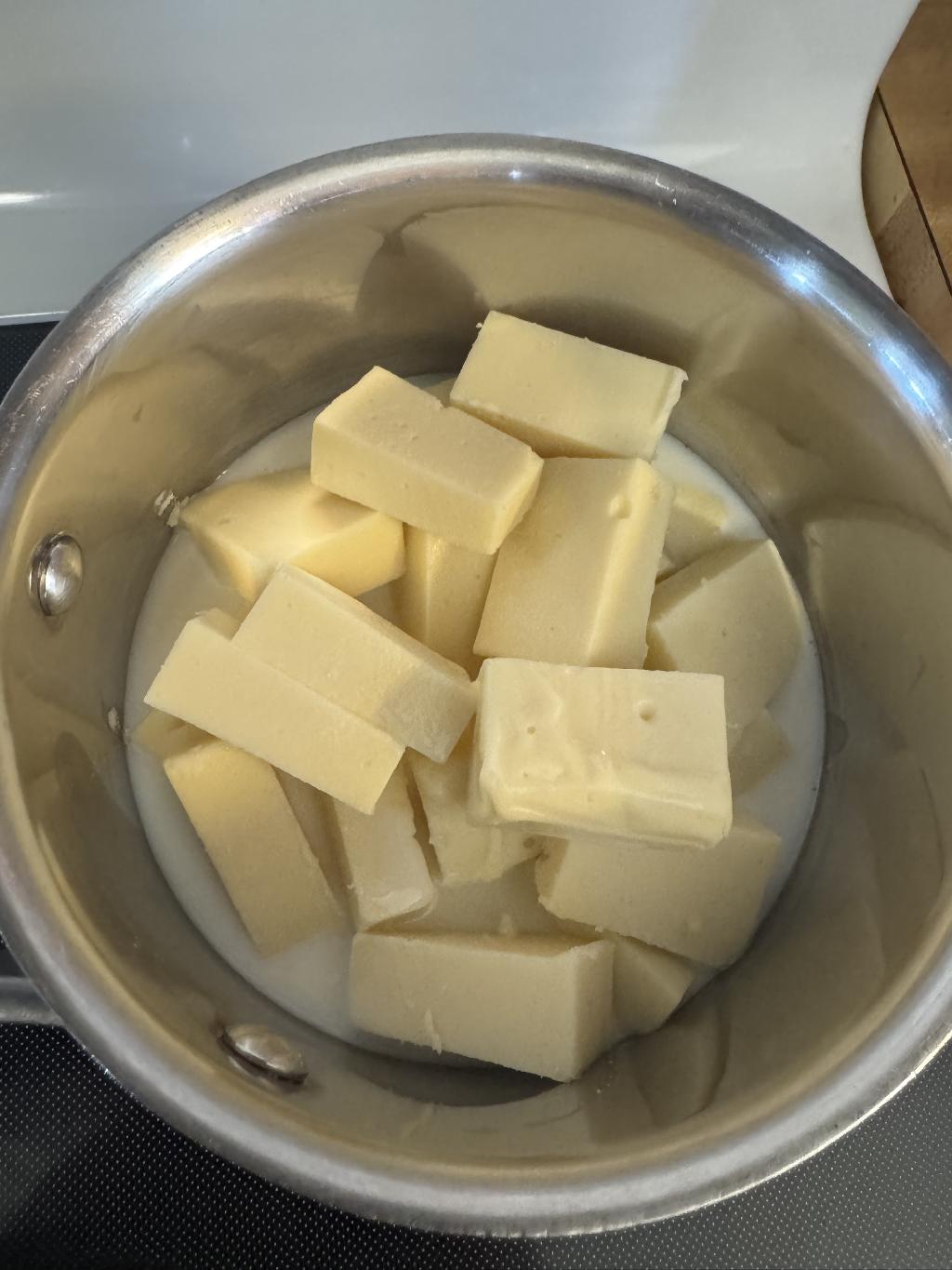 Step #1 If you have a block of Queso Cheese, like Ole brand, cut into one inch cube size pieces. Add to a saucepan with milk and a pinch of salt. Set heat to medium low and allow to melt. Use a spatula to mix and combine every little bit until the sauce comes together. If you’ve bought Queso Dip in a jar, you can just heat it up.