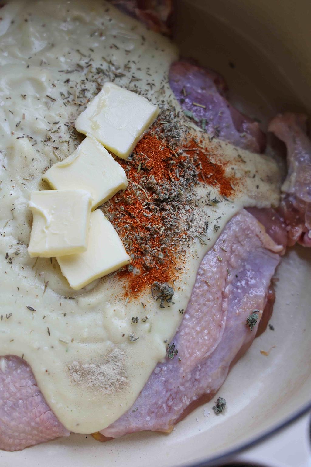 Step #3 - Preheat oven to 300° Fahrenheit. Move oven rack to the lower third. In a medium-size Dutch oven, add pheasant in one layer and sprinkle with salt. Pour the cream of chicken over the pheasant, along with 4 pats of butter, sage, thyme, rosemary, white pepper and paprika. Then stir in 2 cups of stock, carrot, celery and onion. Bring to a simmer. Close the lid and transfer the pot to a preheated oven, and cook for 1-2 hours, or until pheasant is tender.