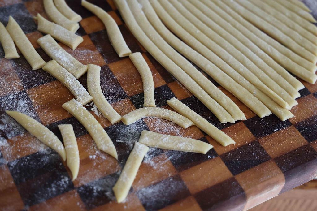 Step #4 Thirty minutes into cooking the pheasant, bring a large pot of salted water to a boil. Place dough on a lightly floured surface and cut in half. Wrap one piece while you work with the other. Dust the rolling pin with flour, and roll out dough thinly, about ¼ inch. Use a pizza cutter to slice dough into 3-inch-long noodles. You can cut your noodles as thinly or thickly as you like; they will expand when cooked. Dust with flour to prevent sticking. To prevent the noodles from clumping together, quickly add each noodle separately into the boiling water rather than dumping them in all at once. Stir and cook for three minutes.