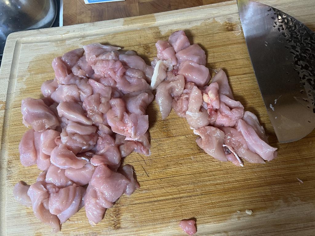 Step #1 Remove skin from Pheasant and cut breast into bite size pieces, about 1 inch. Save the skin.