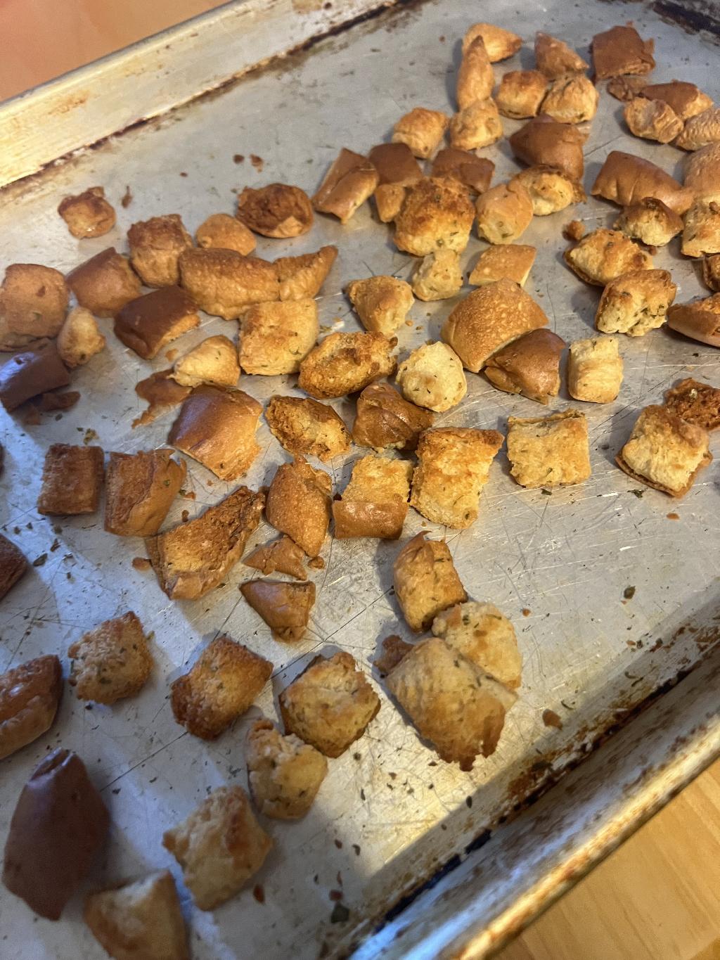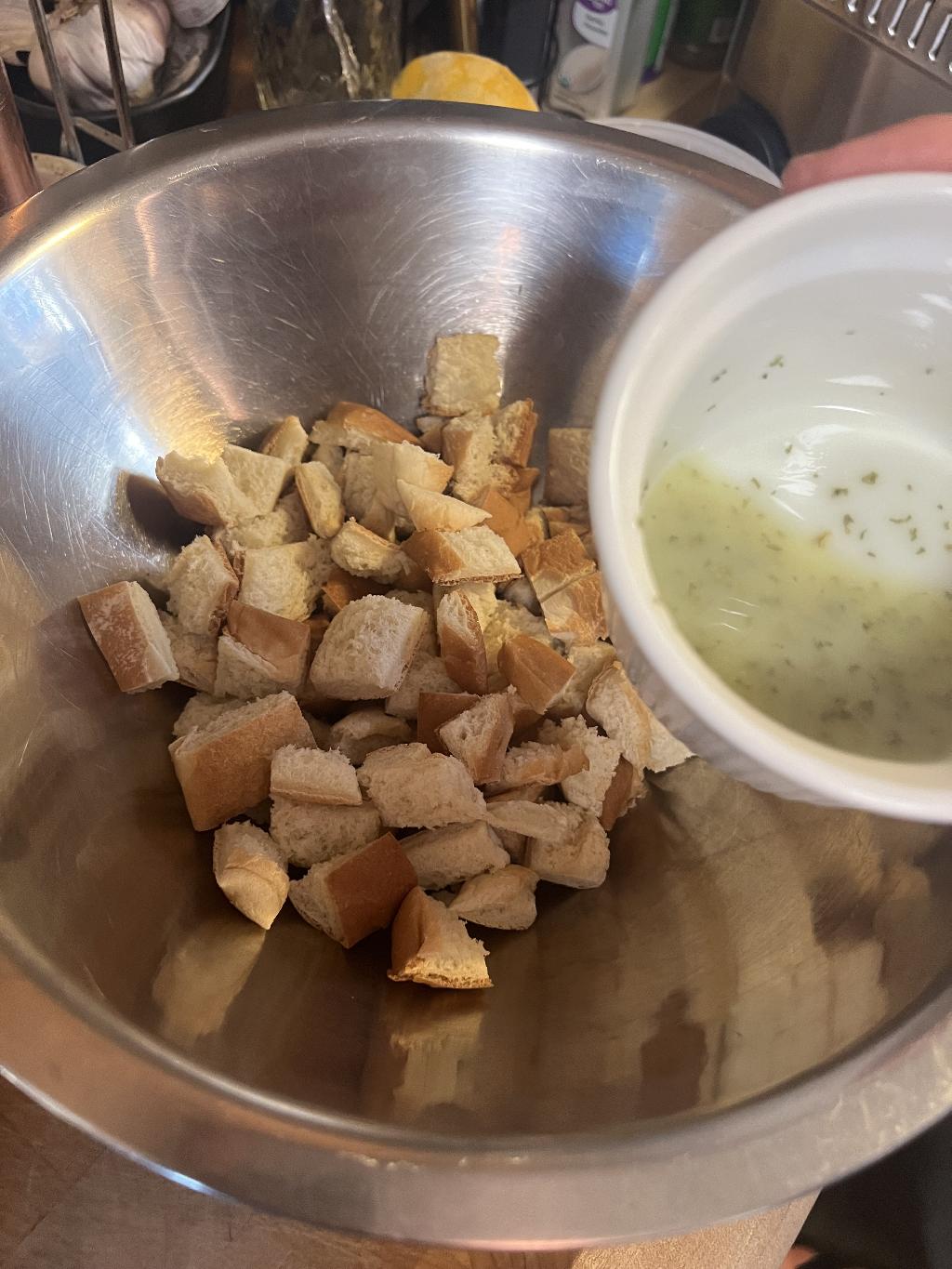 Step #4 For breadcrumbs, preheat oven to 400 degrees. Cut hamburger buns into small cubes, rought ½ inches. Add cubes to large bowl, pour in melted butter then sprinkle in dried parsley. Toss to coat bread in melted butter.