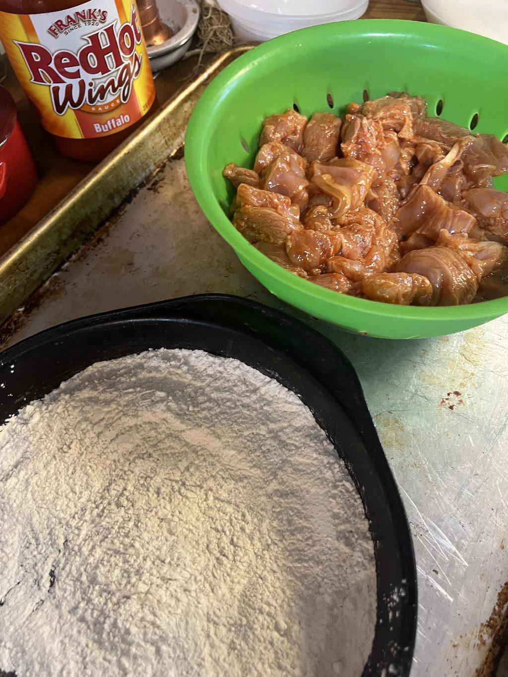 Step #8 When oil reaches temperature, remove pheasant from refrigerator. Working with a few pieces at a time, dredge the pieces through the flour and corn starch mixture, then drop into the fryer.