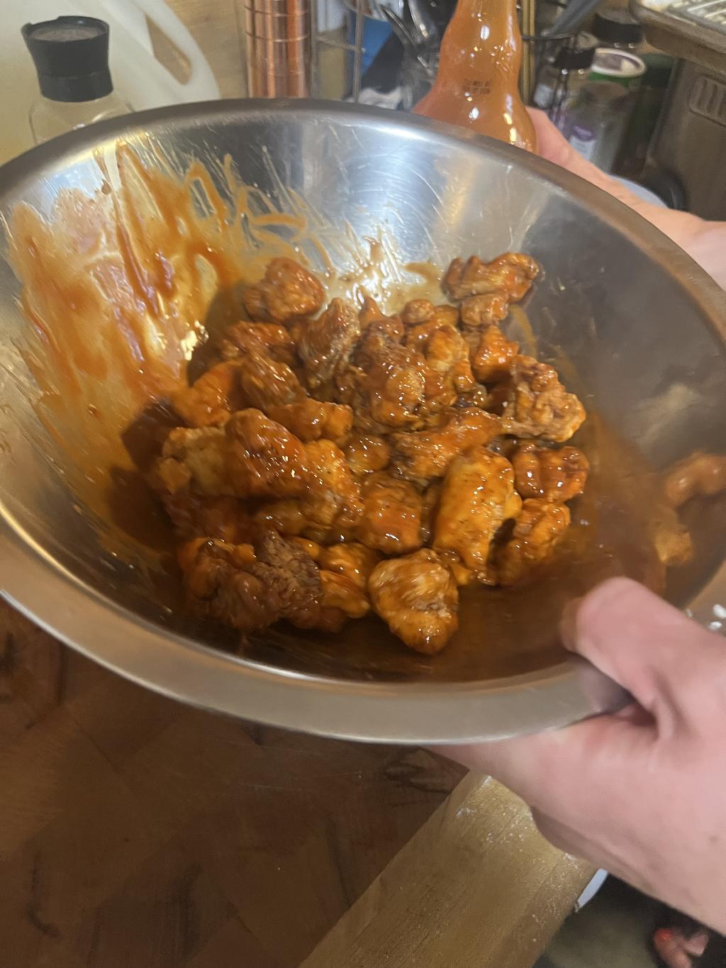 Step #11 Add cooked pheasant pieces to large bowl and toss with buffalo sauce until all the pieces are coated.