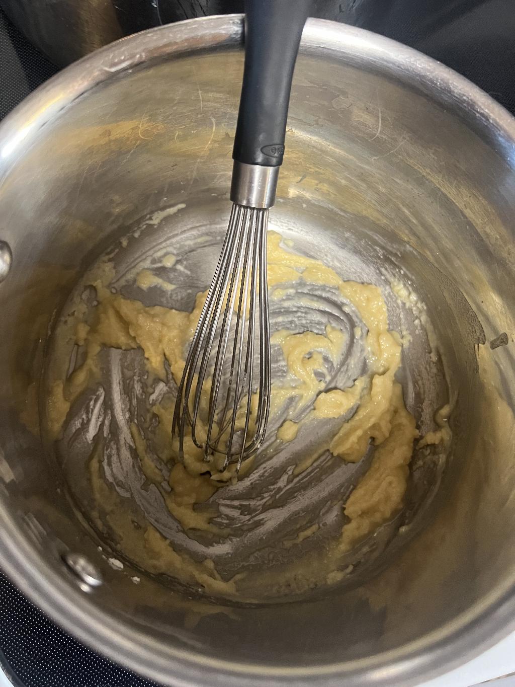 Step #15 Start cheese sauce by adding two tablespoons of butter and two tablespoons of all-purpose flour to saucepan. Allow butter to melt, stirring to combine with flour.