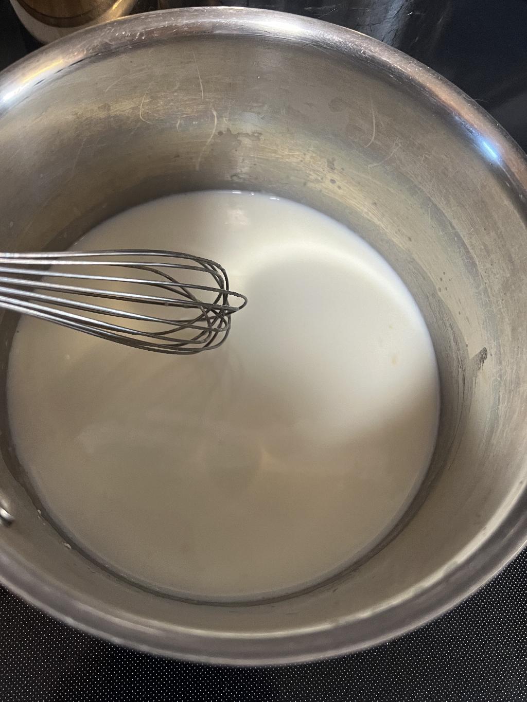 Step #16 Add warm milk, stirring to combine. Continue stirring until sauce starts to thicken.