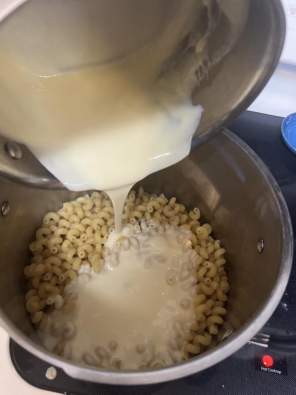 Step #18 Season with salt, then combine noodles and cheese sauce in your stock pot. Add Buffalo seasoned pheasant.