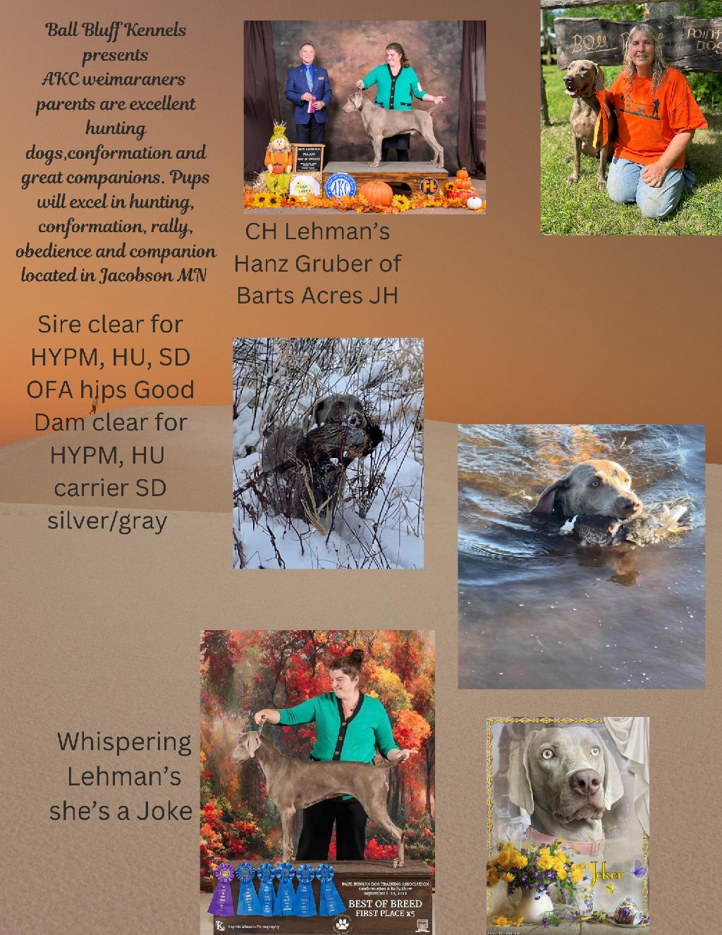 AKC Weimaraner pups 17 weeks old. They have had bird introduction started on potty and crate training. Sire has his AKC CH and JH titles and UKC CH title. He is amazing in the field and water hunting. Dam is half way to her UKC CH title. She also loves birds and hunts upland. Pups have 2 puppy shots have been properly wormed, microchipped and paid lifetime national data base recovery. For more info please call. #gundogs #gundogcentral #huntingdogs #sportdog #fielddog #dogsofgundogcentral #weimaraner #puppiesforsale #gray #forsale #gundogsforsale #huntingdogsforsale #female #jacobson #minnesota